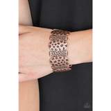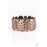 Delicately hammered in antiqued detail, round and rectangular shaped frames are threaded along stretchy bands, creating a bold tribal look around the wrist.