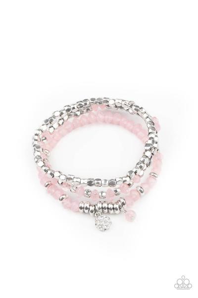 A glimmering collection of silver discs, silver cube beads, and opaque pink crystal-like beads are threaded along stretchy bands around the wrist, creating icy layers. A matching opaque crystal and white rhinestone encrusted charm swing from the display for a whimsical finish.