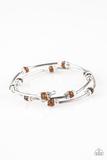 Dainty brown crystal-like beads and shimmery silver accents alternate along a coiled wire to create a refined infinity wrap style bracelet.