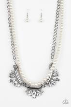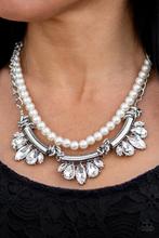 A classic strand of white pearls and dramatic silvery chain drape below the collar. Infused with heavy metal accents, teardrop and marquise cut white rhinestone frames connect into a show-stopping fringe. Features an adjustable clasp closure.