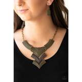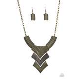 Radiating in studded details, antiqued brass and copper plates link below the collar, joining into a fierce geometric pendant. Features an adjustable clasp closure.