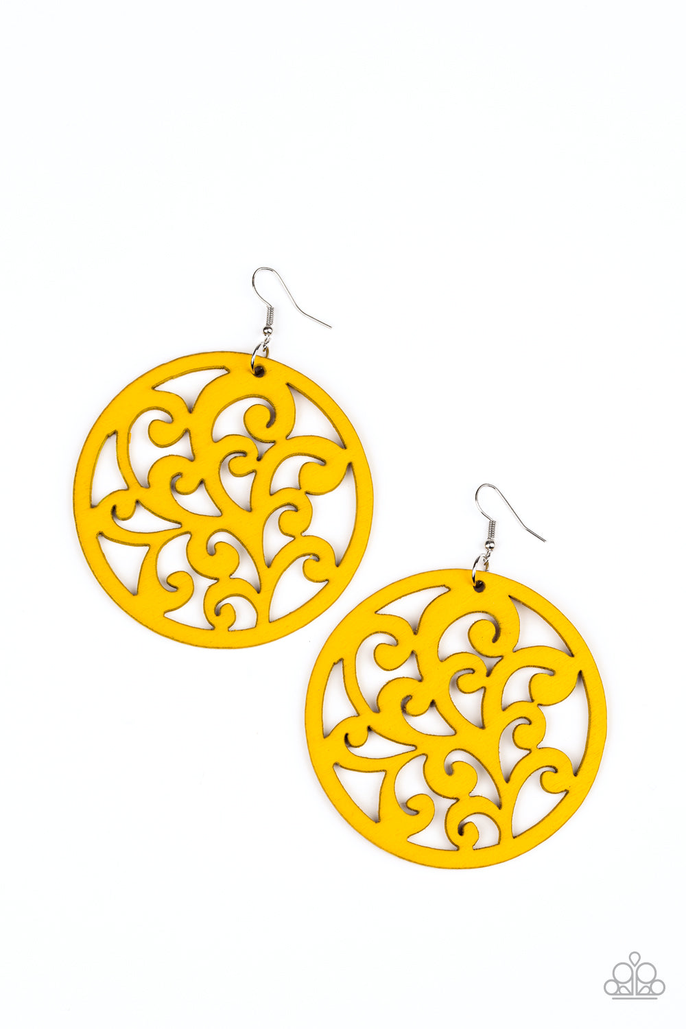 Stenciled in vine-like filigree, a yellow wooden frame swings from the ear for an earthy look. Earring attaches to a standard fishhook fitting.