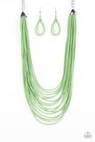Infused with two bold silver fittings, row after row of green seed beads layer across the chest for a seasonal fashion. Features an adjustable clasp closure.