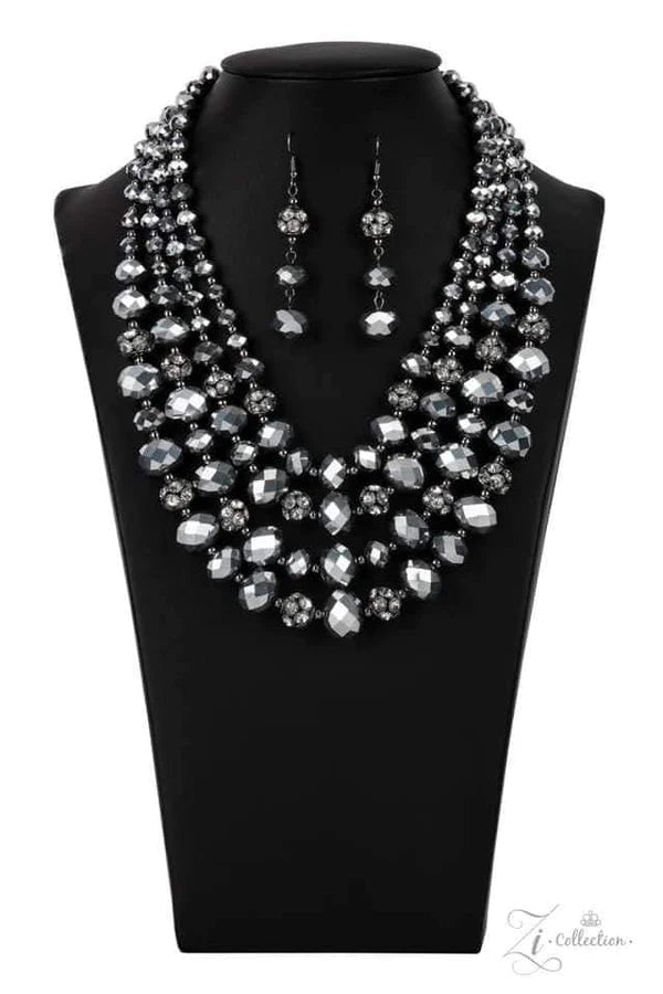 Gradually increasing in size and intensity, dainty gunmetal beads, faceted hematite-like crystals, and white rhinestone studded gunmetal ornaments unapologetically connect into dauntless rows below the collar. The radiantly regal layers flash and refract the light, creating a smoldering statement piece. Features an adjustable clasp closure.