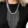 A sassy curtain of mismatched gunmetal chains tapers from the bottom of a dramatic row of glassy white rhinestones that have been delicately fastened to an edgy row of flattened gunmetal chain. The exaggerated fringe cascades down the chest, resulting in a dauntless attitude that demands attention with every swish of the fearless fringe. Features an adjustable clasp closure.