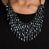 Row after row of metallic blue beads swing from an edgy net of glistening gunmetal links, layering into an edgy fringe below the collar. Featuring flashy faceted edges, the mesmerizing beads spark and sizzle into a conflagration of sparkle below the collar. Features an adjustable clasp closure.