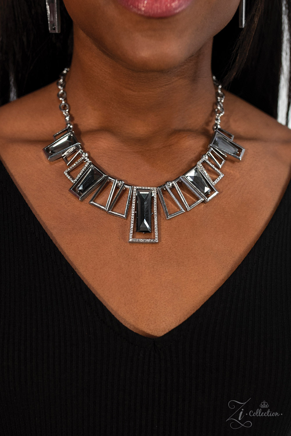 Funky geometric frames with slightly flared edges fan out along the collar, demanding attention. A few of the frames are encrusted in sparkling rhinestones, while others are brushed in a high-sheen finish to create gorgeous contrast. As a finishing touch, smoky emerald cut gems are sprinkled throughout the piece, adding rich depth to the edgy design. Features an adjustable clasp closure.