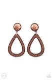 Bordered in antiqued copper studs, a hammered disc attaches to a hammered teardrop, creating a rustic lure. Earring attaches to a standard clip-on fitting.
